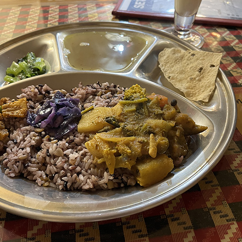 いつものベジダルバートを頼み飲み物はロキシー(ネパール焼酎)ではなくラッシーにすると「お酒は要らないんですか?」と聞かれる。