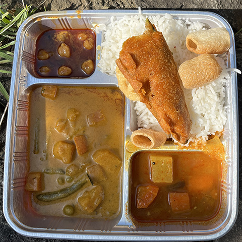 ベジミールスはラッサム、サンバル、ダール、ポリヤル、トマト&じゃがいも、バターミルク、デザート。