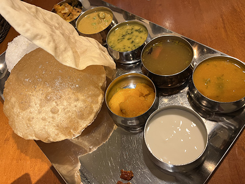 ミールスを頼むとここはプーリー、チャパティ、ナン、ドーサと言ったパンの中からひとつ選べる。