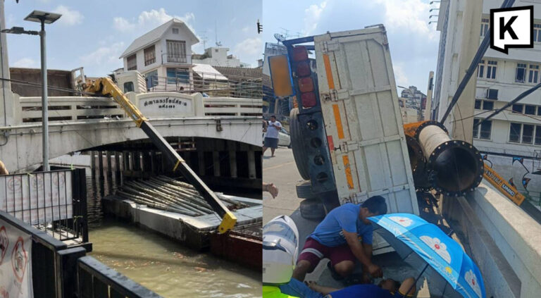 バンコク市内プラナコン地区の橋で6輪トラックが横転し搭載していたクレーンが橋からぶら下がって運河に落ちそうになっていたという記事。