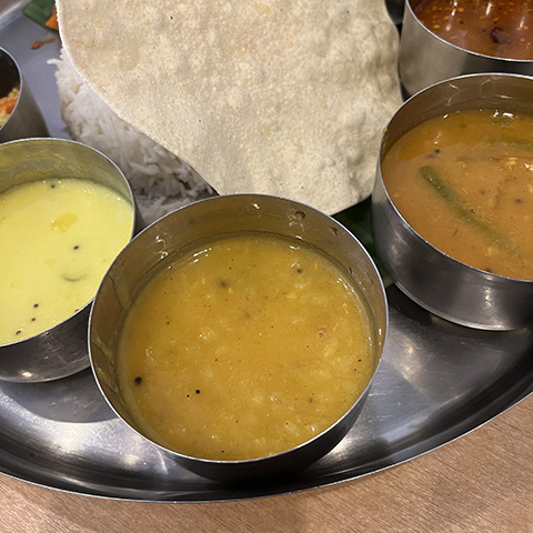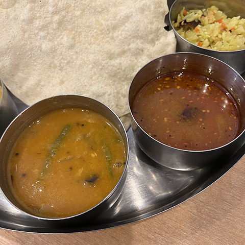 ラッサムは固形物無しだが、酸味強め、胡椒多め、ピリ辛で店名のカレーリーフの香りがほのかにしていて好みの味。
