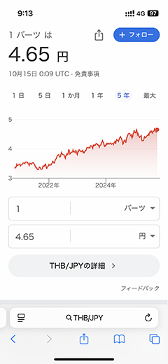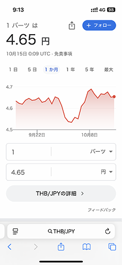 10/15 バーツの値動き バーツが高い、高いと騒がれているのでこのひと月と5年間のバーツの値動きを調べてみたらきれいに右肩上がり。 2020/10が3.5JPYくらいだからそこから30%くらい上がっている。 タイ国内の物価も上がってるしこりゃ日本人は行けなくなるよ。