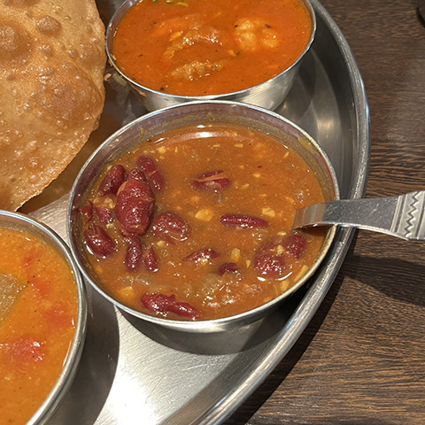 カレーは2種類選べるのでチキンとシーフード、豆の中からシーフード、豆を選ぶ。