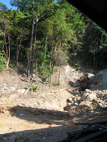 そういえば自分の部屋(バンガロー)のとなりに緑色のトタンが張り巡らされているから何かと思って覗いてみると、チャーン島でも結構被害が出たというニュースを読んだ気がするからたぶん雨季に起きたのだろう、裏山のがけが崩れて隣にあったらしいバンガローが更地にされ、その向こうにあるバンガローには補修が施されていた。