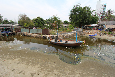 わきには水が枯れてどぶのようになった川が横たわっており、その向こうには砂浜が続いていたものの、ここからは渡りようもなく。