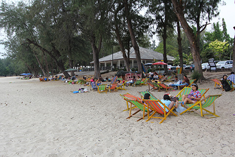 木陰に置かれたビーチチェアでタイ人家族がくつろいでいる。