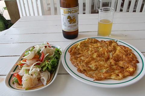 料理はヤム・プラムック(イカのヤム)とカイチアオ・プー(蟹入り玉子焼き)。