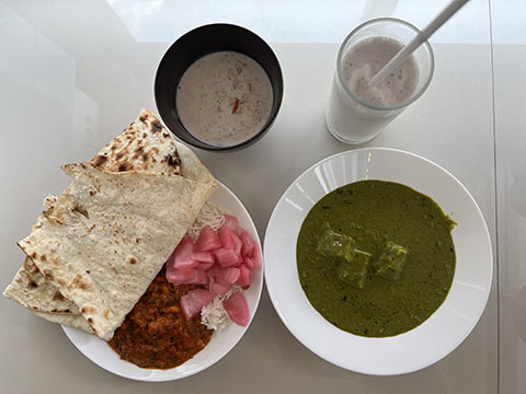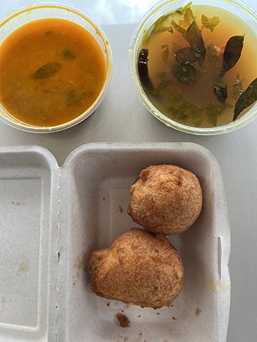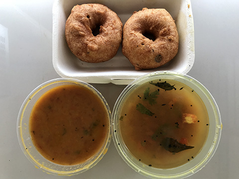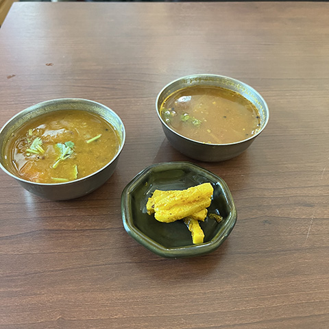 カレーは一つ一つが多めではあるもののラッサム(好物のちょっと酸っぱい野菜スープ)とザブジー(マイルドな野菜カレー)の2つのみ。