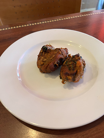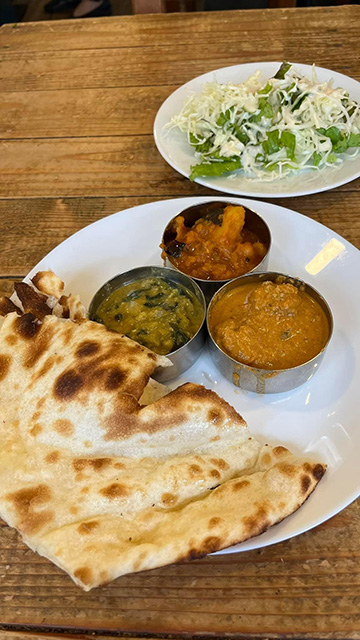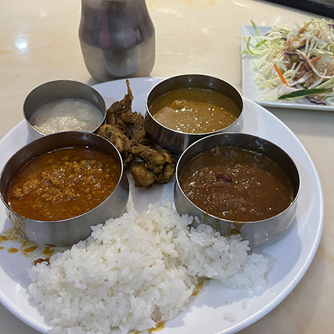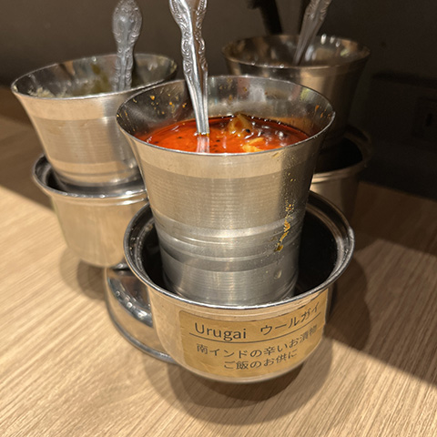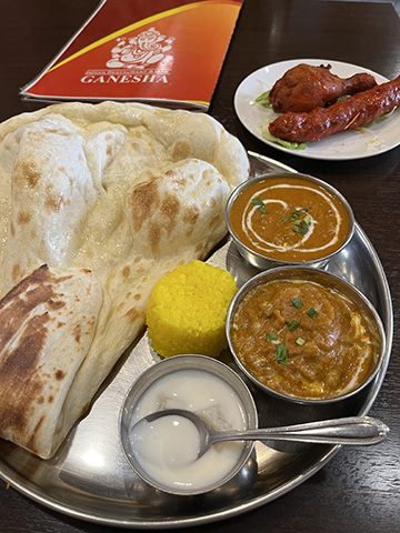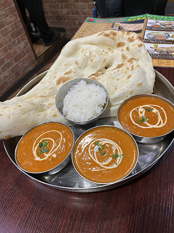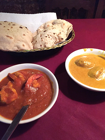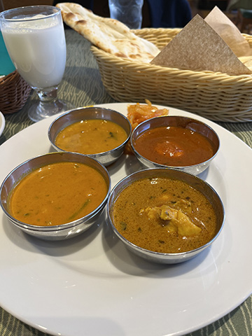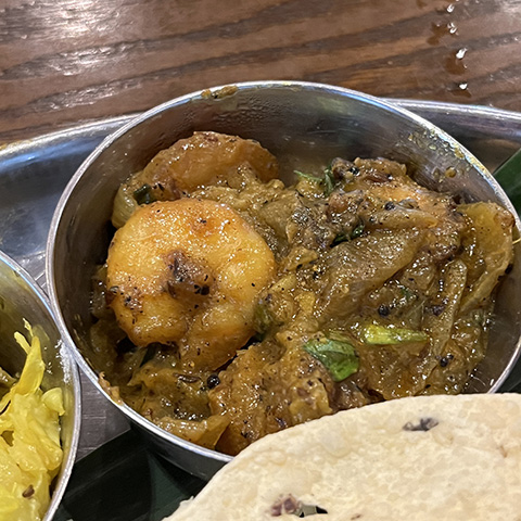 全般的にクリーミーな北インド系の多い中、手前のはここでは一番好きなゴア風海老カレーだった。