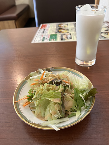トマト、玉ねぎ、キュウリのグリーンサラダが付いてくるのが目新しい。