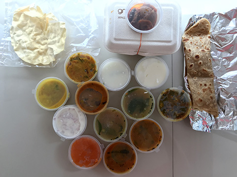カレー5種、ライス、パパッド、チャパティーそれにデザートが付いベジターリーが179THB+配送料13THBとSaravanaa Bhavanの268THB+15THBと比べるとだいぶ安い。