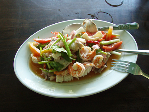 独占的でしかも輸送費がかかるという場所柄仕方ないということもあるが、ヤムタレーにクイティアオ、ビアシン2缶で670THBもしてしまった。