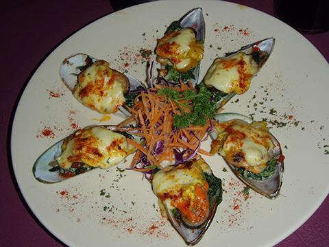ほうれん草(じゃないかも)とムール貝のマヨネーズ焼き、チーズとチリパウダー掛け。