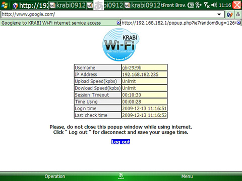 夜更けに部屋でWiFiをOnにしてみたらKrabi WiFiという電波が捕まったので、試しにブラウザーを開いてみたら案の定ログイン画面が出てホテルのレセプションでIDを買えと表示された。