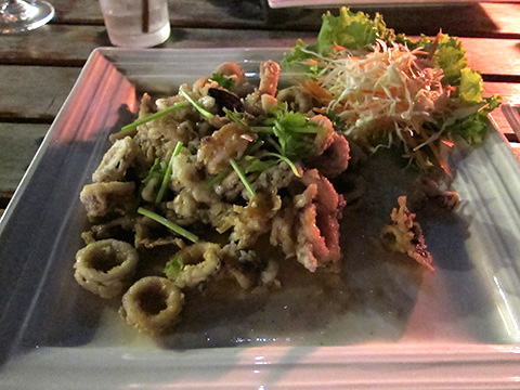 リング状にしたイカを揚げてニンニク味のソースをかけたもの。