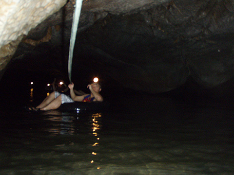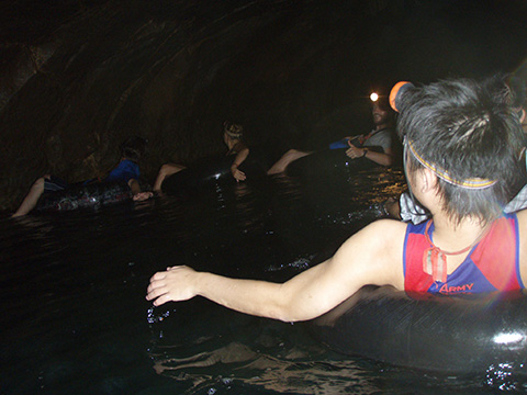 その先からは後ろの人のチューブに足の甲を引っかけムカデ状態になって真っ暗な洞窟を各々のヘッドランプの明かりを頼りに進む。