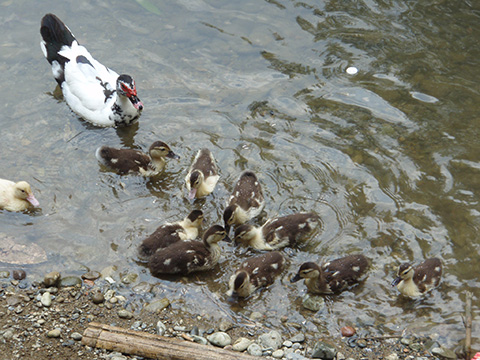 小屋の脇の洞窟から流れ出ている小川にここで飼われているらしいアヒルの親子がやってきたので、食べきれずに余ったバゲットをちぎって投げるとひよこたちが奪い合って食べる。