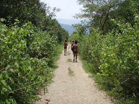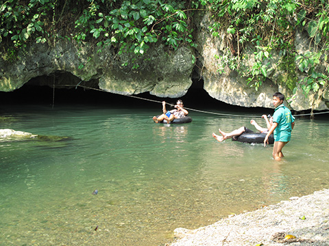 途中で滝トレッキングの2人を降ろし30分ほど13号線を北上、Water Caveの看板を左折してオフロードを川岸まで進む。