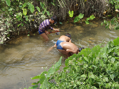 シンガポール人の一人が川の畔で水中めがねを付けてスピア(水中銃)を手にした地元の子供と話していたら、「フィッシュ!」と仲間に声をかけた。