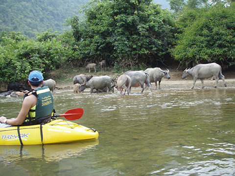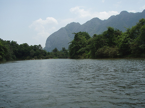 ワンビエンらしいゴツゴツした山々と清流の織りなす美しい景色を眺めながら休んでは漕ぎ、休んでは漕ぎということを繰り返す。