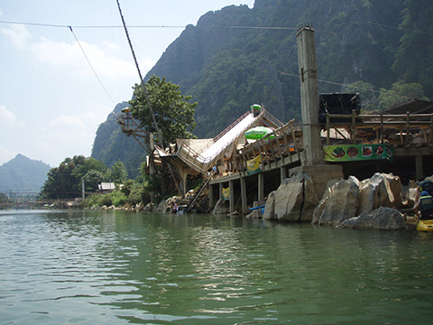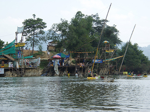 白茶けた木の板で作られたテラスにビアラオを手にしたファランがたくさんおり、バンジージャンプやワイヤースライダーに興じている者もいてそういう店がずーっと続いていた。
