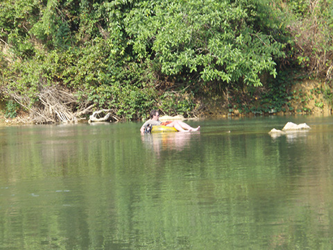 ここから先は流れがかなり緩くなりチュービングの連中はとどまっているのも多かったが、ビール瓶をチューブから垂らして冷やしているのを見るとあれもあれでいいかと思う。