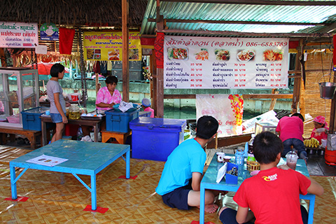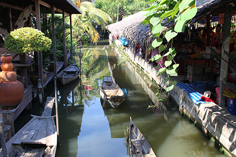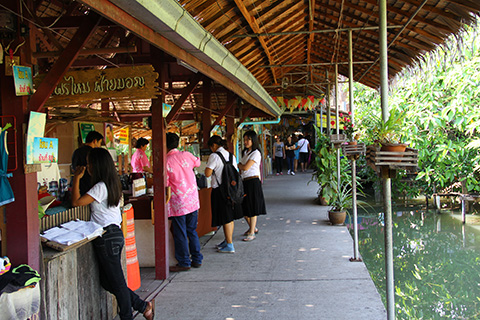 英語のFloating marketも日本語の水上市場も、有名なダムヌンのように川の上に浮かんだ小舟で商売しているイメージだがタラートナームは必ずしもそうではなく、川沿いに開かれた市場(しかもかなりの割合で観光用)であることも多い。