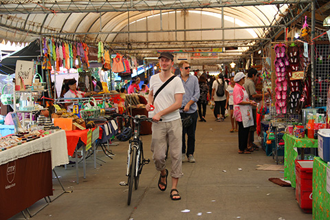 川に沿ってコンクリートの通路が延びその両側に区分けされた様々な種類の店が並んでいる。