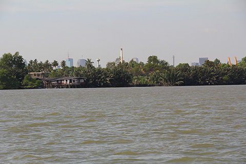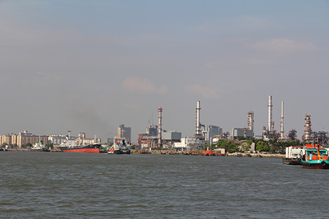 大型コンテナ船の行き交うチャオプラヤー川の右手にはまがまがしい石油プラントらしき設備が見えその向こう側にはバンコク市内の高層ビルが並んでいる。