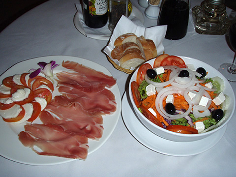 赤ワインをキャラフェー(500ml)で頼んだ後にメニューを眺めてパルメハムとモッツェリアチーズの前菜、グリークサラダ、シーフードスパゲッティーを注文する。