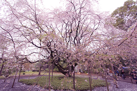 敷地内も相変わらずすごい人出だが小雨交じりな中、通り沿いには様々な桜が咲き誇り見学客を楽しませていた。