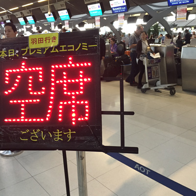 行きのBKK-HND線、チェックインカウンター傍に「プレミアムエコノミー席に空席がございます」という案内板が立てられていた。