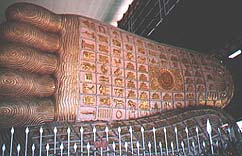 いわゆるリクライニングブッダがある。バンコクのワットポーのそれより大きいか?まつげがピンとしていて目がきれいだ。