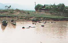 共同井戸で汲んだ水を頭に載せて歩いている子供がいたり、アヒル追い(?)のじいさんに追い立てられてアヒルが田んぼから集団で戻ってきたり、水牛が気持ちよさそうに水浴びしている。ほのぼのとした、のどかな風景だ。