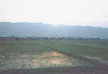 山の手前は一面の田んぼ。日本の田舎の風景に近い。
