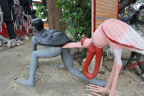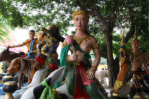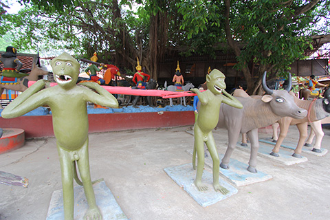 それらのおどろおどろしい像の足下に犬がのんきに寝ているところがやはりタイである。