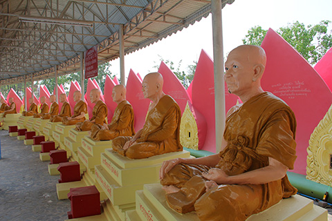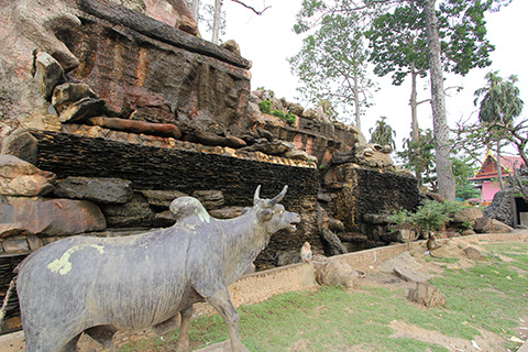 傾いたチェディを中心に5,6個のチェディが取り囲みその右後ろにオレンジ色の袈裟を掛けた仏像が姿を見せている。