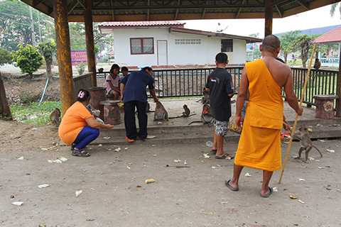 男たちはバケツをぶら下げていてサーラー(休憩小屋)までやってくるとそのバケツの中からバナナを取りだして猿たちに配り始めた。