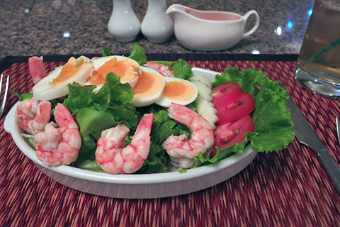 エビ入りのサラダ、サウザンアイランドドレッシングで内容は確かに違いないんだけど、カクテルグラスでなく皿で出されるとこれはサラダじゃないのかという気がする。
