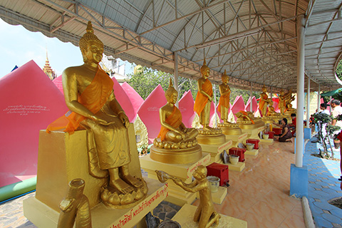 チェディの門をくぐると周りをぐるっと何十体もの金色の仏像が取り囲んでいる。