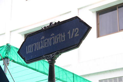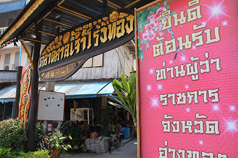 するとタラートナームの表示は見つからなかった(この時はタラートナームだと思い込んでいた)が、ウィセットチャイチャーンの街の直前でタラートボラーンサーン・チャオローントーンという案内板を見つけたのでたぶんこれがそうじゃないかとその道に入っていってみる。