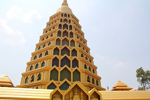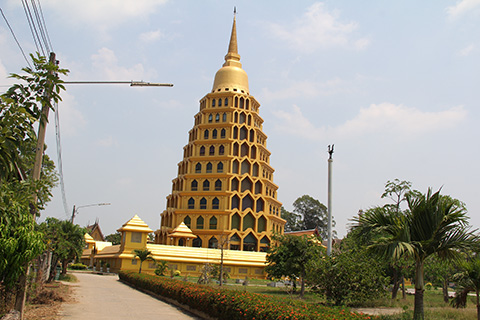 てっぺんはタイによくある円錐型ながらその下4/5くらいは8角形で無数の窓がはめられている。