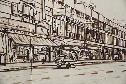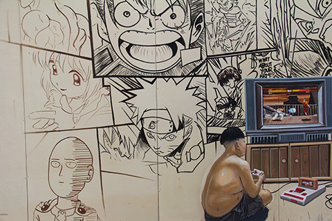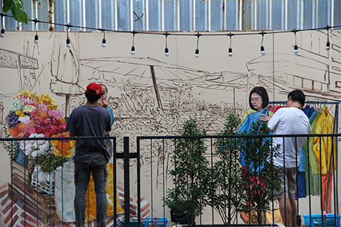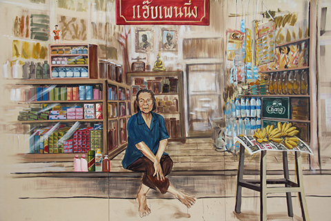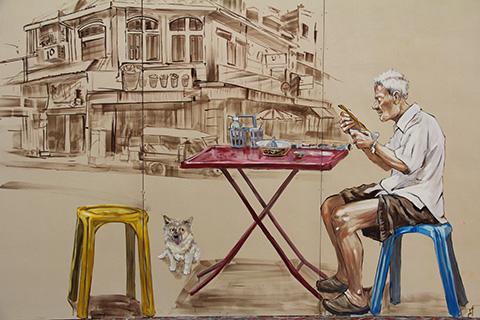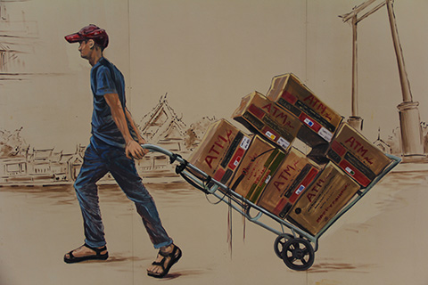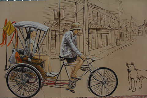 まだまだアウトラインだけで塗りつぶされてない部分が多いが、サムローやタンブン中の僧侶、運河を行く船などに混じってファミコンで遊んでいる少年や洋服屋台で品物を選ぶ女性、バンコクの清掃員など今までになかった題材が描かれている。