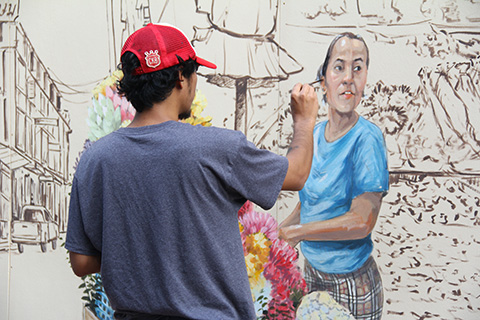 足場を組んで制作中のところにちょうどやって来た地元風じいさんが「この人はだれじゃ?」と尋ねると「特にいません」とリーダー風の人が答えていた。
