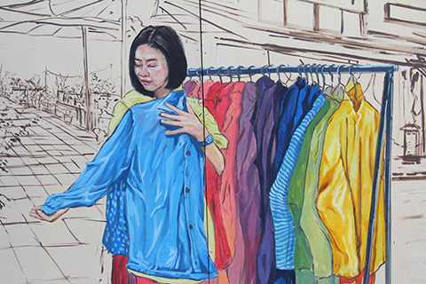 そのまま進んでいくとビニールシートで覆われた先あたりから作風がガラッと変わり、落ち着いた色調から色鮮やかなものになる。