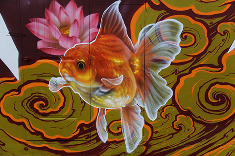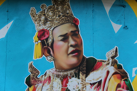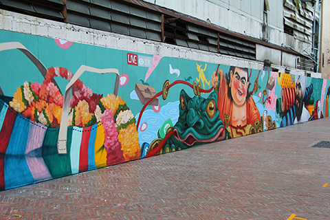 これは今回はスカかなとヤワラート通りにかかる先程の橋まで戻るとその向こう側のビルの建物にその壁に絵を描いている最中のようなポップな絵が描かれていた。