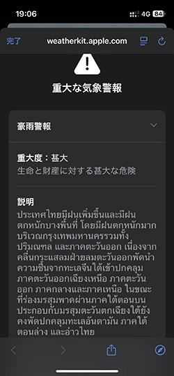 10/14 豪雨警報 ピポポとスマホから突然アラームが鳴って何事?と見てみると「豪雨警報」 え?全然降ってないけどこれから降るのか?とクリックしてみるとバンコクの情報だった。雨季の終わりだからまた洪水だろうと天気の方を見てみたら降水量はさほどなく。 いったいなんなんだ?