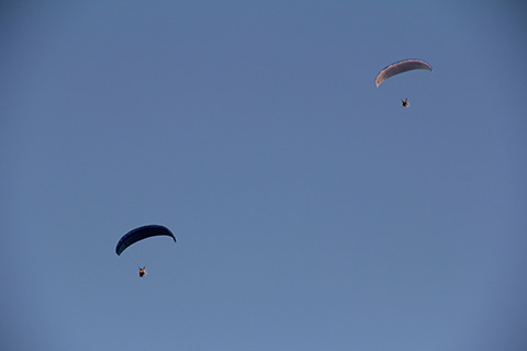 門を出て歩いてGoogle mapを頼りに歩いていくと頭上からパタパタと音がしたので見上げるとモーターパラグライダーが2機、やってきていた。