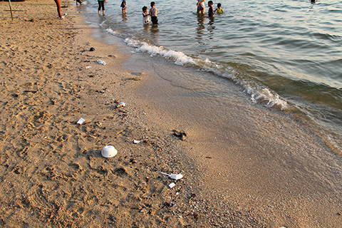 そのビーチパラソルの隙間を通って水際まででてみると、日本人の間ではビーチではなく海水浴場と言われているのがなるほどなと思った。