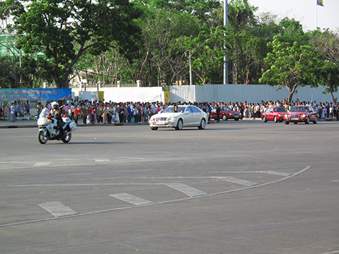 ところがアナンダ・サマコム宮殿の敷地を出るとすぐの通りに警官が車の流れを停めていた。